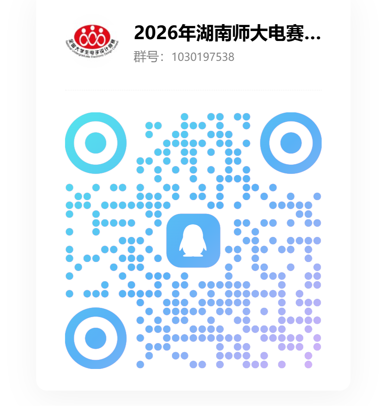 报名时间从即日起至2026年5月7日。有意愿参赛的同学加入竞赛QQ群:1030197538(2026年湖南师大电赛交流群),在QQ群在线填写参赛信息表,逾期不接受报名。报名参赛的同学请扫描下面二维码:备注“年级+学院+专业+姓名”如20工设院电信张三。
